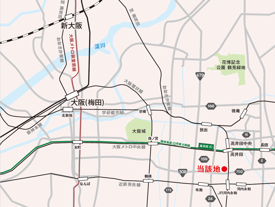 This planned site is located in the Takaida area of Higashiosaka, where industrial companies, particularly in the manufacturing industry, are concentrated. The location offers highly convenient access via public transportation. It can be reached from five stations on three railway lines, including Kawachi-Eiwa Station on the Kintetsu Nara Line and JR Kawachi-Eiwa Station on the JR Osaka Higashi Line, and is just 9 minutes by foot from the Takaida Yanagidori Naka stop (Osaka Bus). The site is accessible in about 5 minutes by automobile from the Takaida Exit of the Chuo Odori/Hanshin Expressway, which runs east-west from Higashiosaka to central Osaka north of the site. The industrial Osaka Hiraoka Prefectural Road passes the site to the south. These thoroughfares make the site favorably located for commuting and transport to and from the city of Osaka and other nearby municipalities.