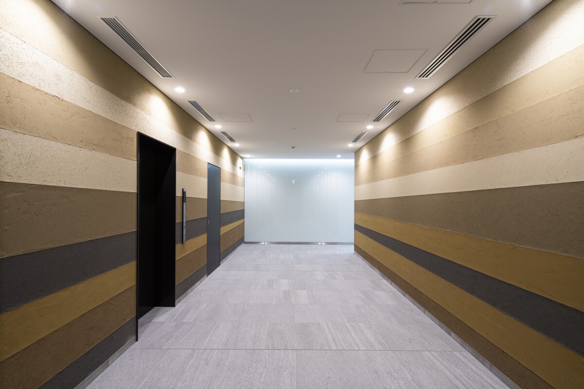 最大2テナントへの分割賃貸が可能であり、各区画には垂直搬送機1基と荷物用エレベーター1基を完備。柱スパンを11m以上確保し、柔軟な倉庫内レイアウトに対応する汎用性の高い仕様となっています。また、エントランスには地域の特性や歴史を反映すべく、周辺に多く建ち並ぶ「町工場」をイメージしたデザインや、建設前の事前調査で発見された遺跡に着想を得た「地層」をモチーフとしたデザインを区画ごとに取り入れました。